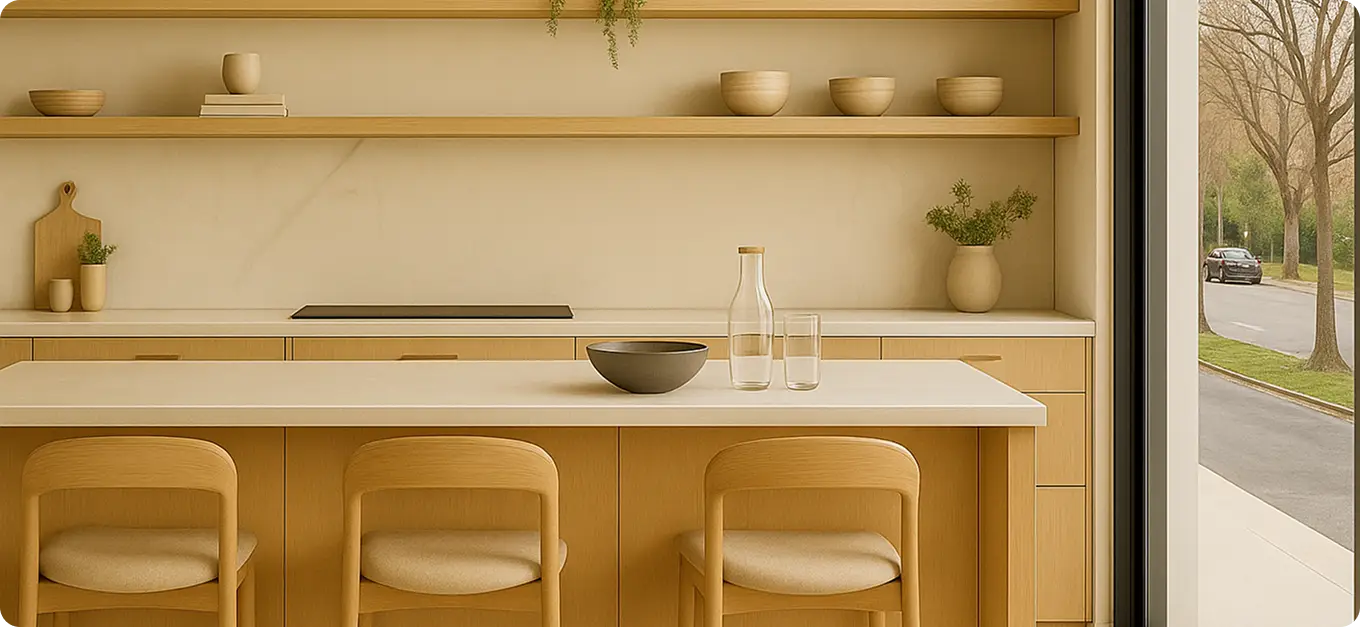 Honed marble benchtops and splashbacks add timeless elegance and texture throughout the kitchen and bathrooms.